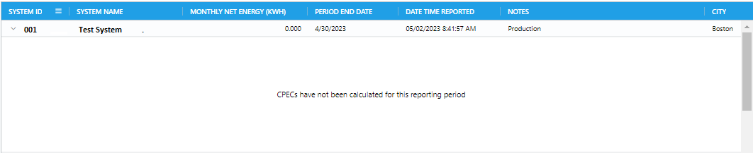 - Every time the users access the page, it will refresh and find the most recent submissions per month for the systems until CPEC calculation takes place for the most recent submission sets. After the calculation has been completed, newer submissions for that month for that system will not appear on the grid.